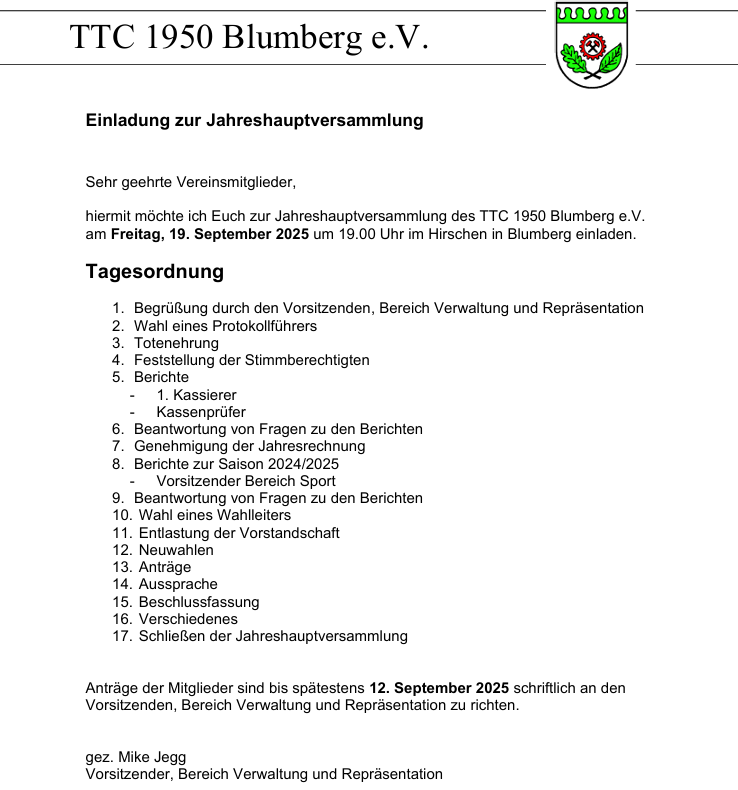hiermit möchte ich Euch zur Jahreshauptversammlung des TTC 1950 Blumberg e.V.